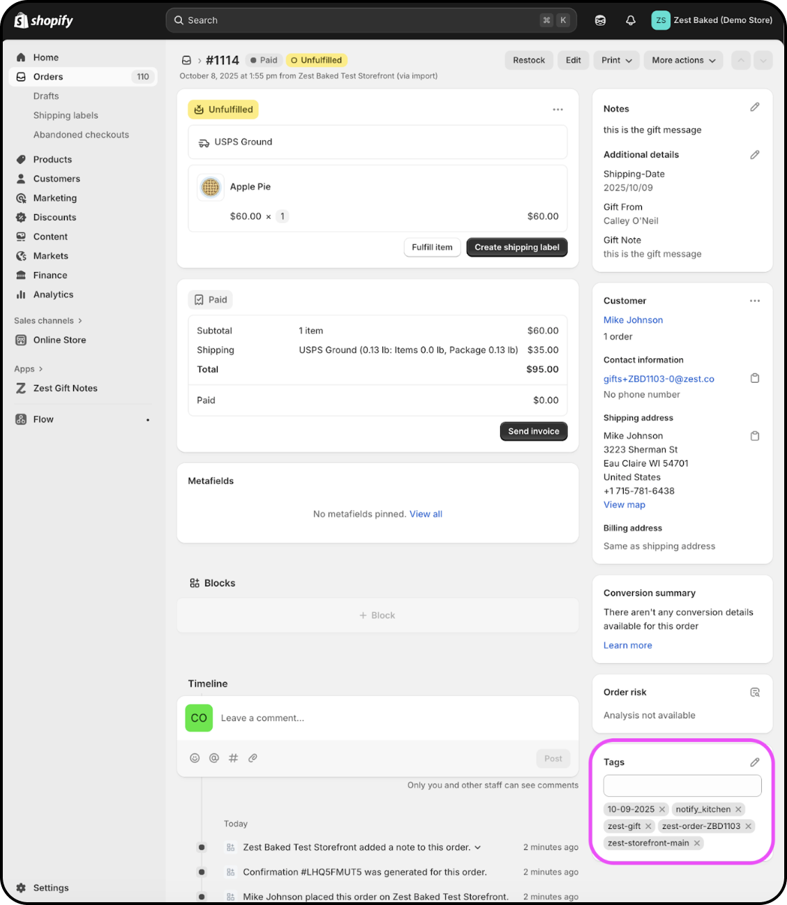 In the example below, the zest-gift tag pushed in from our main corporate gifting storefront is going to automatically notify the kitchen that one of our baked goods was just ordered as a gift.